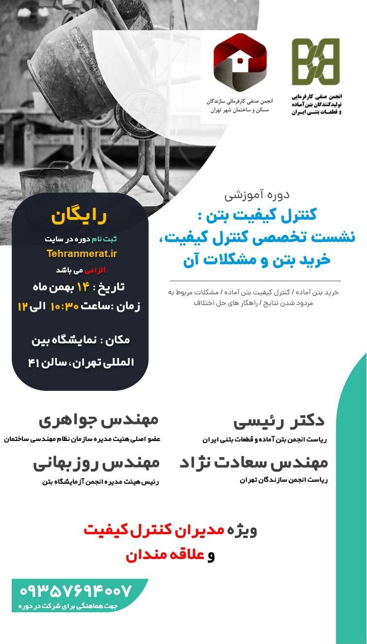 از علاقه مندان به صنعت بتن دعوت می شود تا دوره و نشست کنترل کیفیت بتن با محوریت خرید بتن آماده و مشکلات احتمالی با آزمایشگاه بتن که در روز ۱۴ بهمن ماه ۱۴۰۴ در سالن ۴۱b نمایشگاه بین المللی برگزار می گردد.