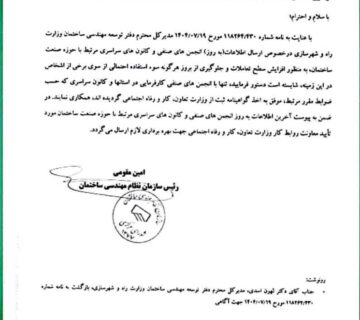 دستور وزارت راه و شهرسازی برای اصلاح فرآیند انتخاب بازرسان نظام مهندسی استانهاانجمنآبان 3, 1404وزارت راه و شهرسازی طی بخشنامهای از سوی دفتر توسعه مهندسی ساختمان، دستورالعمل جدیدی را درباره نحوه انتخاب ... ادامه مطلب